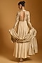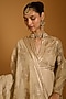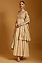 Featuring a beige anarkali in chanderi base with gold applique and strip work detailing. It is paired with churidar pants and a dupatta. Accentuate it with traditional kundan or polki statement earrings, a delicate potli bag and elegant heels for a stylish ensemble, ideal for wedding functions, festive celebrations or special occasions.
