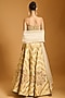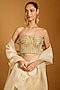 Featuring a beige and gold lehenga in taffeta base with mandala embroidery and crystal rope detailing. It is paired with a corset having crochet strip work and crystal rope detailing, including an ivory silk organza dupatta. Accentuate it with traditional kundan or polki statement jewellery, a delicate potli bag and elegant heels for a stylish ensemble, ideal for wedding functions, festive celebrations or grand occasions.
