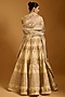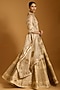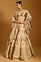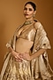 Featuring a beige lehenga in taffeta base with gold applique and sequins embroidery. It is paired with a gold lamme quilted blouse and a silk organza dupatta. Accentuate it with traditional kundan or polki statement jewellery, a delicate potli bag and elegant heels for a stylish ensemble, ideal for wedding functions, festive celebrations or grand occasions.
