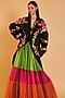 Featuring a black oversized kimono jacket in neoprene base with applique, floral and gradient crystal heart hand embroidery.