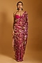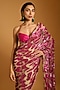 Featuring a fuchsia saree in net base with cheetah motifs and sequins embroidery. It is paired with a brocade and raw silk corset. Accentuate it with minimal gold or pearl earrings, a structured clutch, and sleek heels for a stylish ensemble, ideal for festive gatherings, cocktail evenings, or wedding celebrations.