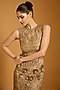 Featuring a gold dress in net base with mix media embroidery. Accentuate it with crystal statement earrings, a sleek metallic clutch and elegant heels for a stylish ensemble, ideal for cocktail evenings or celebratory dinners.