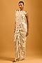 Featuring an ivory and gold quilted corset in lamme and taffeta base with 3D floral detailing. Accentuate with a flowing skirt or tailored high-waisted pants, and accentuate it with delicate pearl or crystal earrings, a sleek clutch and elegant heels for a stylish ensemble, ideal for cocktail evenings or celebratory dinners.