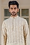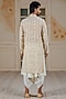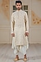 Featuring a gold kurta in silk chanderi base with hand embroidered sequins stripes. It is paired with contrasting ivory mushroom silk flap dhoti pants.