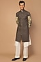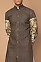 Featuring a grey sherwani in matka silk base with gold, copper and silver aari hand embroidered sleeves. This contains only one piece.