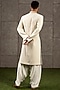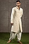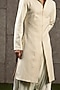 Featuring an ivory and gold top stitch sherwani in matka silk base with zari embroidered collar. It is paired with a matching kurta and patiala pants in rayon base.