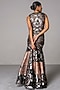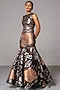 Featuring a metallic black fishtail gown dress in neoprene mesh base with leaf and butterfly metallic applique. This contains only one piece.