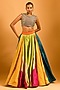 Featuring a multi-colored asymmetrical paneled skirt in raw silk, dupion and lamme base. Style it with a fitted silk blouse or an embroidered crop top, statement gold earrings, a sleek clutch, and elegant heels for a stylish ensemble, ideal for cocktail nights or wedding functions.