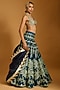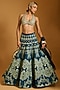 Featuring a teal and aqua lehenga in raw silk and dupion base with crystal and floral threadwork. It is paired with an aqua raw silk blouse having booti work and an organza dupatta. Accentuate it with statement chandelier or diamond earrings, an embellished clutch and strappy metallic heels for a graceful ensemble, ideal for engagement ceremonies, sangeet nights, or elegant evening celebrations.