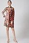 Featuring a red and pink shirt dress in linen satin base with digital print and chintz embroidery. It has a collar and full sleeves.