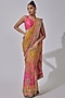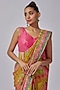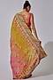 Featuring a sunset orange saree in pure crepe and georgette base with sequins and beaded hand embroidery including floral print. It is paired with a contrasting blouse.