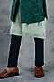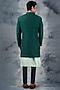 Featuring a bottle green indo western jacket in raw silk base with resham machine embroidery. It is paired with a contrasting pistachio green kurta and pants.