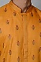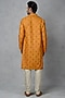 Featuring a tangerine orange kurta in silk base with thread embroidery. It is paired with contrasting light gold aligarhi pants.