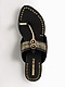 Featuring a pair of black kolhapuri flats in anti-slippery rubber base with braiding and golden kasab hand embroidered straps. It has 0.3-inch heels and a cushioned insole.