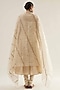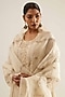 Featuring an off-white anarkali in maheshwari stripe base with aari embroidery. It is paired with churidar pants, a tissue checkered maheshwari dupatta having aari embroidery and a slip. Accentuate it with statement jewellery and heels for festive occasions or wedding ceremony.