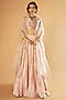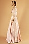 Featuring an onion pink lehenga in pure silk base with jaal and sitara embroidery. It is paired with an embroidered blouse and an organza dupatta. Style with delicate chandbalis and soft glam makeup for a romantic feel, perfect for intimate ceremonies or pre-wedding events.