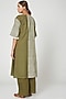 Featuring an olive green kurta in cotton base with geometric handblock print. It is paired with matching palazzo pants and an ivory dupatta.