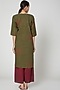 Featuring an olive green kurta in cotton base with geometric handblock print. It is paired with contrasting maroon palazzo pants.