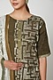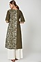 Featuring an olive green kurta in cotton base with geometric handblock print. It is paired with contrasting white palazzo pants and a dupatta.