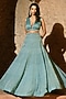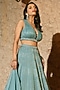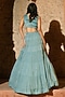 Featuring an aqua blue lehenga in organza and shantoon base. It is paired with a ruched blouse and a dupatta. Accentuate it with polki jewellery and block heels for a sangeet or wedding ceremony.