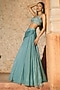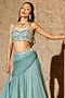 Featuring an aqua blue cowl lehenga in organza, shimmer chiffon and shantoon base. It is paired with an embroidered top and a dupatta. Accentuate it with polki jewellery and block heels for a sangeet or wedding ceremony.