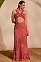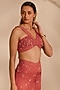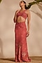 Featuring a dusty pink mermaid skirt in organza and shantoon base with palm tree embroidery. It is paired with an embroidered bustier. Accentuate it with statement jewellery and heels for sangeet ceremonies.