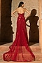Featuring a red corset gown in soft net and shantoon base with embroidery and attached trail. Accentuate it with zircon jewellery and block heels for a sangeet or cocktail ceremony.