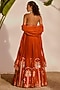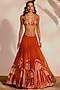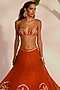 Featuring a rust orange lehenga in shantoon and organza base with palm tree embroidery. It is paired with a bustier having applique work and a dupatta. Accentuate it with statement jewellery and heels for sangeet ceremonies.