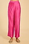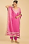 Featuring a fuchsia pink kaftan in striped tissue base with geometric yoke and marodi hand embroidery. It is paired with straight pants. Accentuate it with polki jewellery and block heels for festive occasions or pooja ceremony.