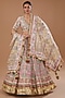 Featuring a multi-colored lehenga in silk organza base with floral gota embroidery. It is paired with a matching silk chanderi ivory blouse and an organza dupatta. Accentuate this designer lehenga with heels and chandbali earrings for a bridal look.