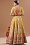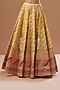 Featuring a mustard paneled leheriya lehenga in chanderi banarasi and chanderi silk base with gota embroidery. It is paired with a matching blouse and a contrasting tissue chanderi embroidered dupatta.