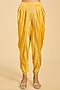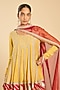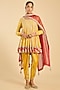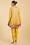 Featuring a mustard short kalidar kurta in cotton silk base with marodi and gota hand embroidery. It is paired with silk dhoti pants and a striped tissue dupatta. Accentuate it with polki jewellery and block heels for festive occasions or haldi ceremony.