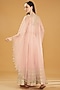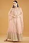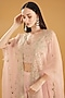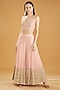 Featuring an old rose bustier in chanderi base with dori hand embellishments. It is paired with cotton silk sharara pants having gota stripe embellishments and an organza embellished cape. Accentuate with statement jewellery and heels for a wedding or sangeet ceremony.