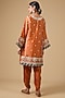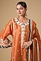 Featuring an orange short choga kurta in chanderi base with ajrakh patchwork, dori and nakshi embroidery. It is paired with modal silk dhoti pants and a malai chanderi dupatta having lace work. Style this with minimal jewellery and heels for a festive occasion or family gatherings.