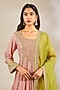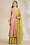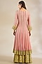 Featuring a pink anarkali in cotton silk, striped tissue and muslin base with embroidery. It is paired with sharara pants and a dupatta. Accentuate it with statement earrings and block heels for festive ceremonies.