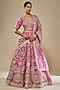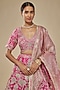 Featuring a pink lehenga in dupion silk, banarasi and organza base with aari, gota, floral, metallic sequins and dabka hand embroidery. It is paired with a v-neck embellished blouse and an organza gota hand embroidered dupatta. Accentuate the designer lehenga with statement jewellery and heels for a bridal look.