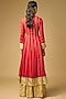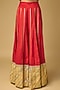 Featuring a red long pleated kalidar anarkali in cotton silk base with marodi and gota hand embroidery. It is paired with sharara having gota border and a striped tissue dupatta. Accentuate it with jewellery set and heels for festive occasions, wedding or haldi ceremony.