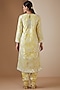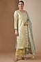 Featuring a yellow kurta in banarasi base with dori and sequins handwork. It is paired with matching churidar pants and a contrasting embellished organza dupatta.