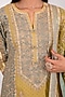 Featuring a sea green and yellow long kurta in chanderi banarasi base with gota lace and nakshi embroidery. It is paired with matching sharara pants and a dupatta in organza base.