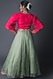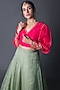 Featuring a mint green skirt in habutai silk and silk organza base with zardosi and gota embroidery. It is paired with a contrasting fuchsia blouse.