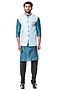 Featuring a powder blue waist coat in raw silk base with embroidery. It is paired with a contrasting blue kurta in cotton silk base and black churidar pants.