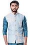 Featuring a powder blue waist coat in raw silk base with thread hand embroidery. It is paired with a contrasting blue kurta in cotton silk base and black churidar pants.