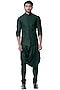 Featuring a seaweed green bundi jacket in raw silk base with embroidery. It is paired with a silk cowl kurta and cotton silk churidar pants. Perfect wear for a wedding or mehendi ceremony, exuding charm and elegance.
