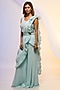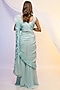 Featuring an arctic blue pleated pant saree in chinon base. It is paired with an organza detachable drape, a crepe blouse having pearl bootas and an embellished belt. Style it with dangler earrings and heels for weddings or festive occasions.