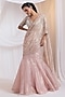 Featuring a blush champagne draped lehenga in organza base with embroidery. It is paired with a tissue blouse having pearls, beads, 3D floral and crystal hangings, including pre-stitched scalloped dupatta. Accentuate it with zircon jewellery and heels for festive celebrations or wedding ceremony.
