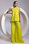 Featuring a chartreuse yellow top in organza base with 3D floral cutwork, pearl and beadwork. It is paired with chinon wide-leg palazzo pants and an inner. Accentuate it with zircon jewellery and heels for festive celebrations or wedding ceremony.