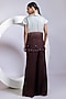 Featuring a grey cowl top in satin base. It is paired with brown chinon flared pants and an ombre silk jacket having 3D floral and applique embroidery. Accentuate it with zircon jewellery and heels for festive celebrations or wedding ceremony.