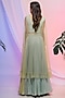 Featuring a lime green and aqua chinon base. It is paired with a ruched blouse and a net embroidered cape. Perfect for a bridesmaid or sangeet ceremony.
