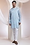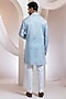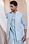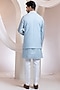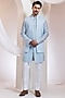 Featuring a sky blue nehru jacket in cotton base with beads and thread embroidery. It is paired with a chanderi embroidered kurta and cotton pants. Style it up with kolhapuri sandals for a festive occasion, wedding, sangeet or engagement ceremony.