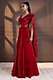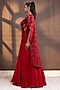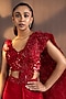 Featuring a red draped saree in chiffon base with floral lace applique embroidery. It is paired with a silk blouse. Accentuate it with statement earrings and heels for a bridesmaid look or a sangeet ceremony.